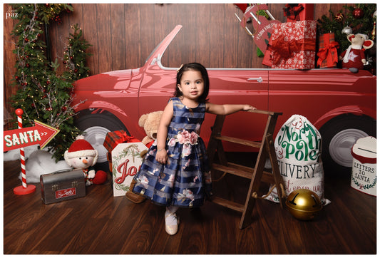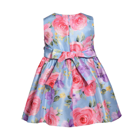 VESTIDO AZUL FLORES MORADAS Y ROSA
