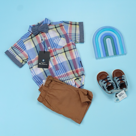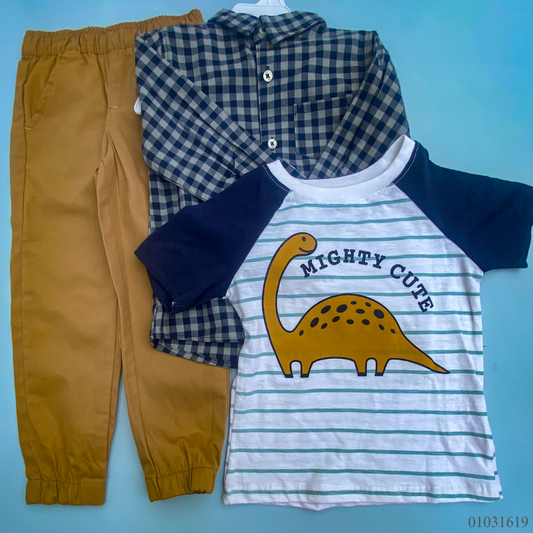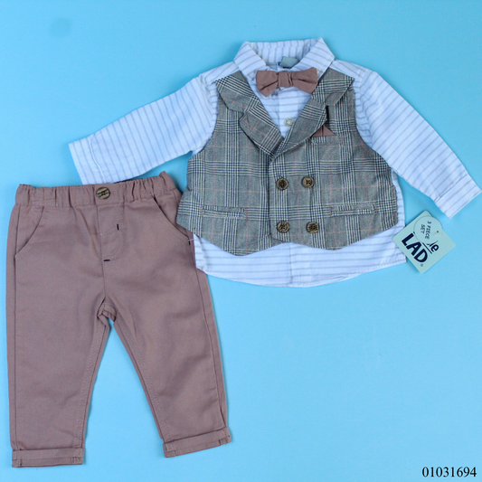 TRAJE NIÑO 3 PIEZAS DINO PANTALON COLOR CAFÉ,CAMISA DE CUADROS