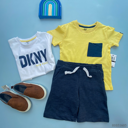 TRAJE NIÑO 3 PIEZAS DKNY SHORT AZUL CAMISA AMARILLA Y CAMISA BLANCA