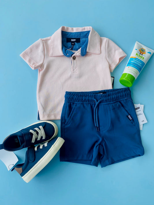 TRAJE NIÑO 2 PIEZAS DKNY SHORT AZUL CAMISA ROSA