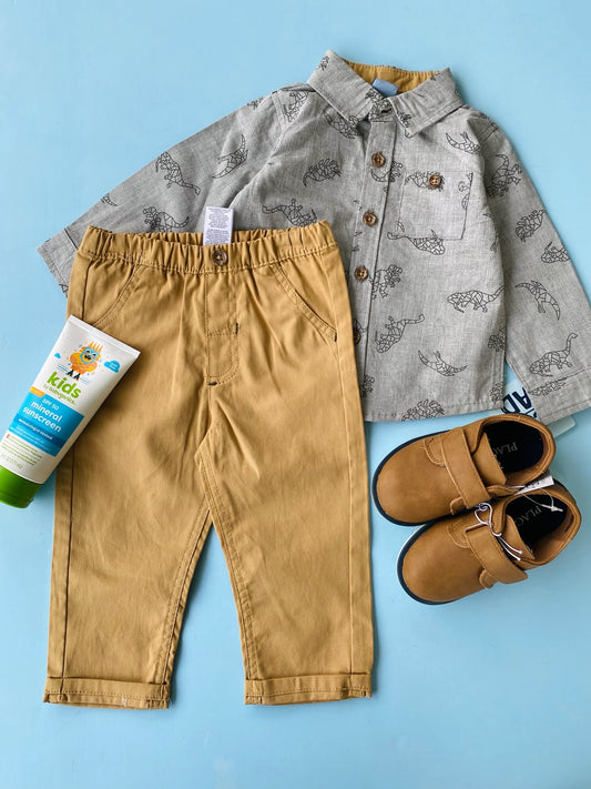 TRAJE NIÑO CAMISA FORMAL GRIS DINOSAURIOS