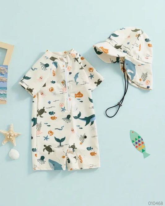 TRAJE DE BAÑO 2PZS BALLENA BEIGE C/GORRO