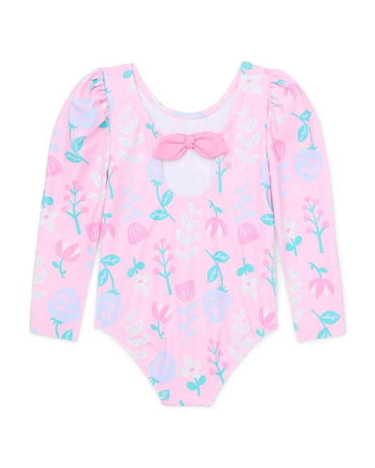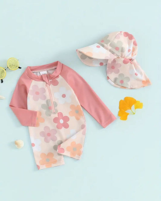 TRAJE DE BAÑO FLORES ROSADO C/GORRO