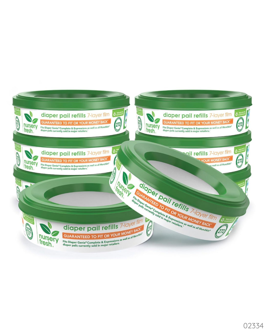 Anillos de recambio Nursery Fresh para los cubos de pañales Diaper Genie y Munchkin. Cada anillo de recambio tiene capacidad para 272 pañales de recién nacido. Los anillos están fabricados con una película duradera de 7 capas.
