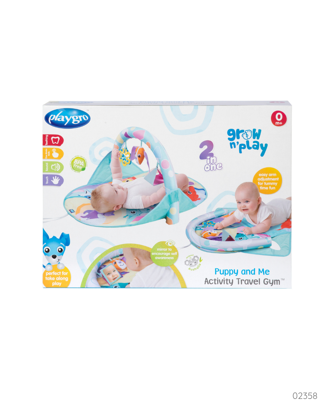 El gimnasio de actividades Playgro Puppy And Me Activity Travel Gym es un producto 2 en 1 diseñado para bebés desde el nacimiento (0+ meses).