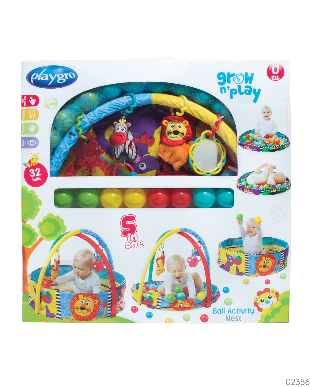 El Playgro Ball Activity Nest es un gimnasio de actividades 5 en 1 diseñado para bebés desde el nacimiento, que se adapta a su crecimiento y ofrece múltiples formas de juego y estimulación.